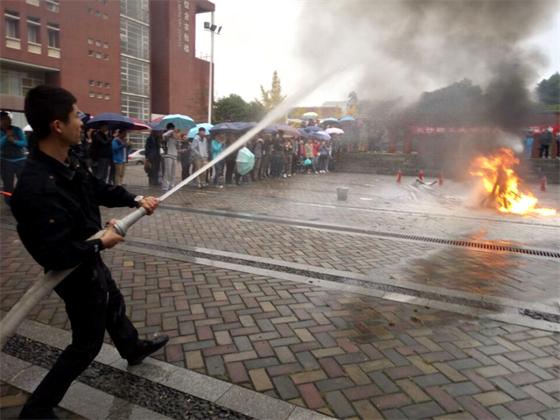首先,保卫处副处长伍接朝作了题为《关注消防 珍爱生命》的消防知识讲座,他结合学校的实际情况,用身边的案例和详实的数据,从火灾的危害、火灾的预防、发现火灾如何处置、火场逃生与自救四个方面介绍了大学生应掌握的相关消防知识。接着,消防专家在讲座现场组织了疏散逃生演练,当会场模拟浓烟滚滚、拉响警报后,同学们在消防专家及保卫干部的组织下,匍匐弯腰,手拿湿毛巾或戴防毒面具,有序的撤离会场。最后,消防专家在文化广场组织了灭火演练,当火堆点燃后,同学们纷纷提起灭火器或水枪,冲向火堆感受灭火过程。