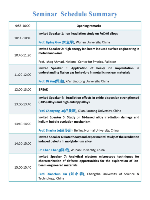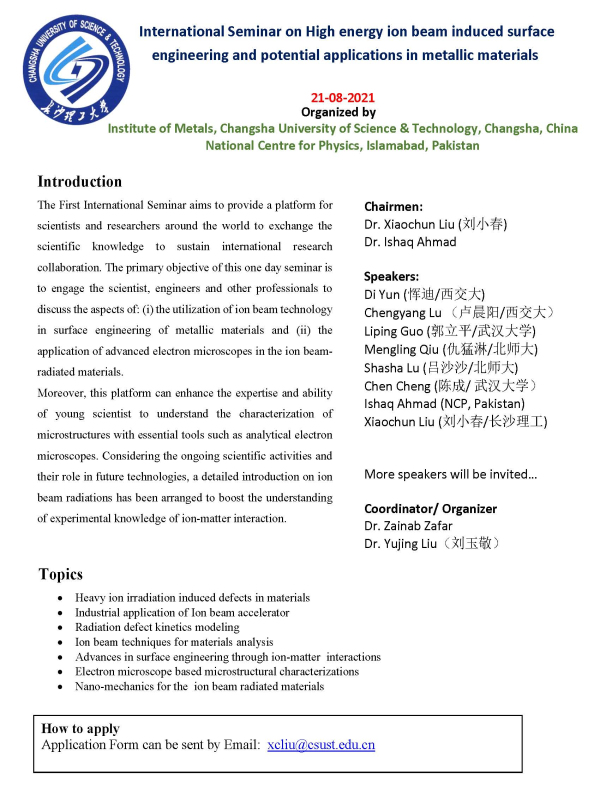 2021年8月21日(本周六),上午9:55-15:00,我院刘小春教授举办“高能离子束辐照表面加工与处理”的在线国际学术报告交流会,旨在促进相互交流与合作,欢迎大家积极参与。