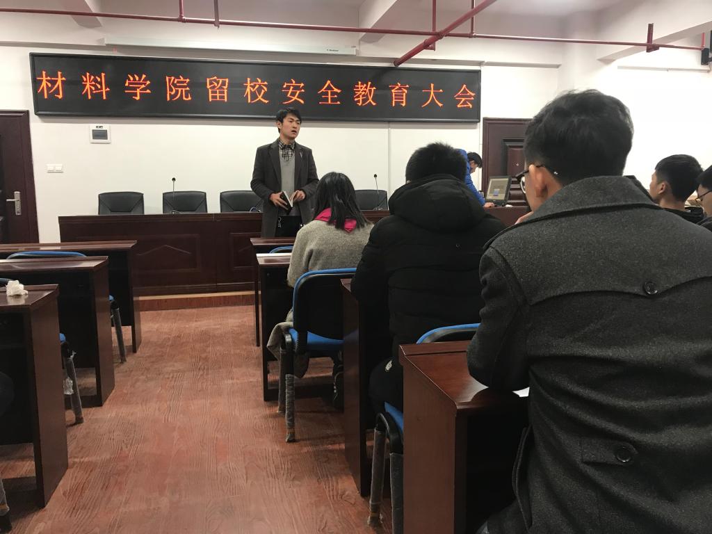 1月16日,材料学院于新能源大楼302室召开寒假留校学生安全教育大会,全体留校研究生、本科生参加,辅导员陈鑫林出席会议。