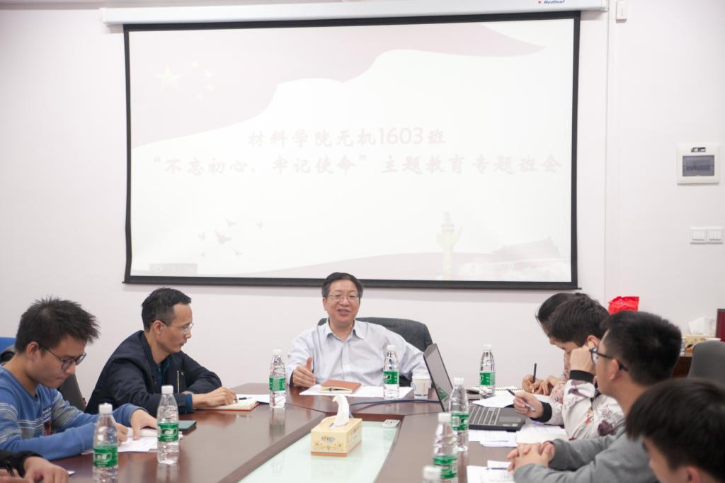 10月20日下午三点,校党委书记付宏渊来到材料学院“不忘初心、牢记使命”主题教育专题班会现场,为所联系班级材料学院无机1603班学生进行主题教育知识导学,材料学院党总支副书记唐青、该班班主任陈召勇参加会议。