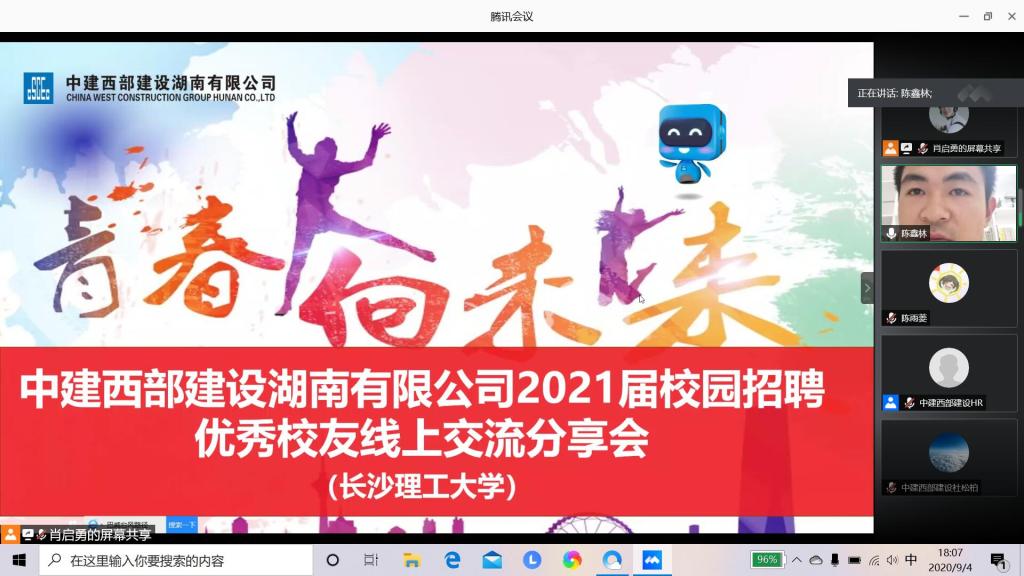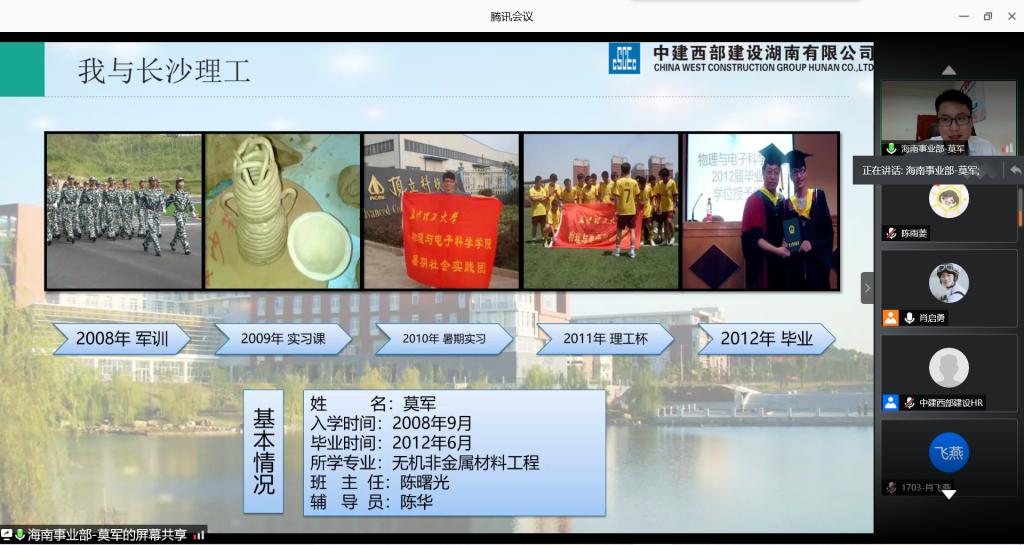 临近就业之际,为帮助毕业生了解企业,更好的做出职业选择,促进同学们的职业规划意识,9月4日,材料学院于腾讯会议举办了主题为勇往“职”前,对话校友——中建西部建设优秀校友线上交流会,这是材料学院生涯发展规划系列活动之一,院党总支副书记陈华、就业专干陈鑫林、中建西部建设湖南有限公司人力资源部相关领导及优秀校友莫军、邓怡帆、汪亮、聂涛出席会议,各年级学生均有参加