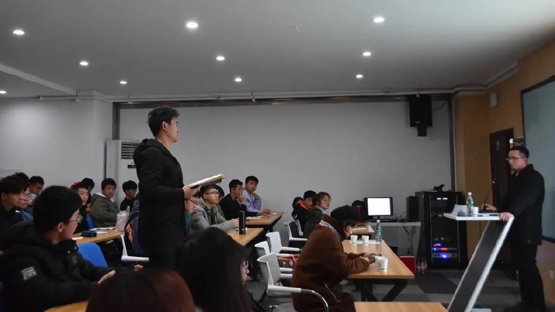 随后,张奕为学员们讲授第一课,张弈以“大赛评委如何看待路演”为主题进行展开。首先,他从评委组成结构及问题偏好和评委评分要素两个方面进行讲解。张奕用真实的例子结合自身的经验,分析了不同类别的评委在评定一个项目时不同的侧重点。他提出应注重解决市场问题以及考虑国家实际情况,要有逻辑的思考,要有创新的思维。接下来,张弈提出了路演时的“三宜”、“四忌”,宜低调、宜简练、宜开放,忌讲背景、忌讲资源、忌讲核心竞争力、忌拖堂。在最后的问答环节,陈鑫林提出在写策划书时如何写财务情况的问题,金鑫提出在遇到项目名称或产品相类似的情况该如何解决,张弈都给出了相应的解决方案并进行了拓展讲解。