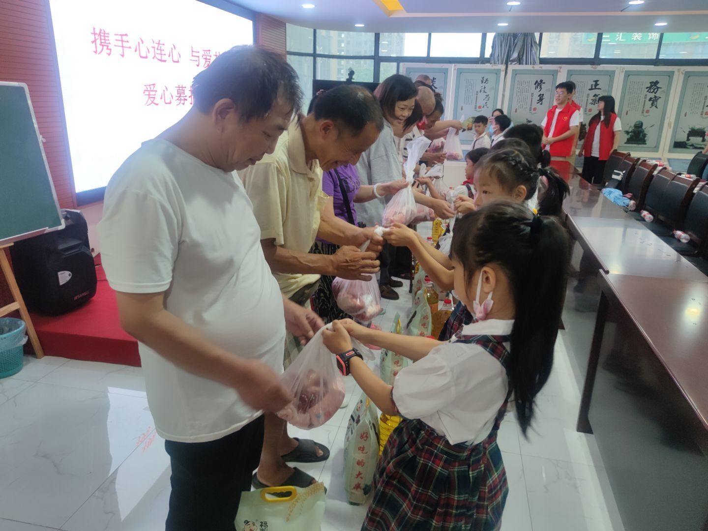 活动伊始,黄土岭小学学生进行才艺表演,孩子们通过歌唱、武术表演、朗诵等节目,为社区困难群众带来欢声笑语。紧接着是爱心募捐仪式,由家长引导孩子们捐出零花钱,并为困难群众献上米、油、肉等慰问品,与此同时也将甘于奉献的精神与乐于助人的正能量传递到社区群众中。最后由龙之彤带来主题宣讲——“国旗的故事,他从国旗的设计和形成过程开始讲起,讲述了在国旗定稿过程中发生的故事,深入剖析了国旗的寓意和内涵,通过国旗故事引导孩子们热爱国旗、尊敬国旗,培养孩子们的爱国情怀。