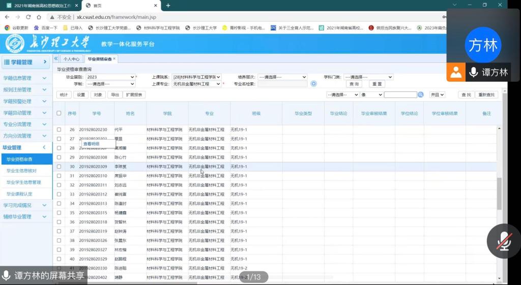 3月6日,材料科学与工程学院2023届毕业生修业学分答疑会在腾讯会议通过线上方式进行,会议由年级辅导员谭方林主持,学院教务办主任李锦文老师主讲答疑,全体2023届毕业生参加了会议。