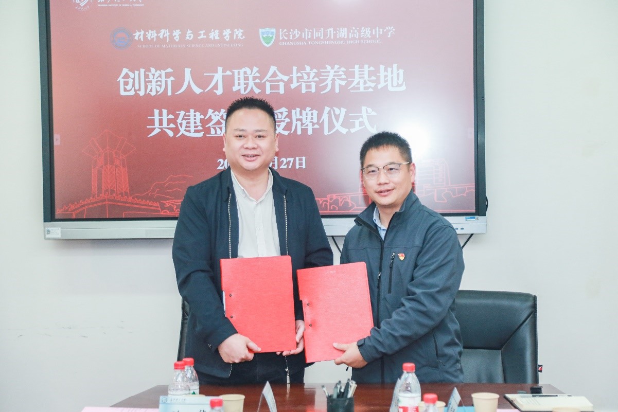 随后,毛卫国、向赞勋代表双方签署“创新人才联合培养基地”共建协议。毛卫国代表437必赢会员中心材料科学与工程学院向长沙市同升湖高级中学授牌。双方就加强人才培养输送、深化重点学科教学合作、合力共建创新实践平台等方面进行了深入交流,进一步达成了合作共识。
