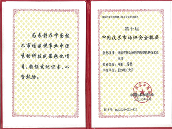2020年10月22日,中国技术市场协会在山东淄博举办了第十届中国技术市场协会金桥奖表彰奖励大会,我院廖红卫色料团队主持完成的成果“铬废弃物为原料的陶瓷色料技术及应用”继第六届金桥奖后,再次荣获项目奖二等奖,项目第一完成人廖红卫作项目汇报,项目组成员詹文俊代表成果完成团队参加表彰奖励大会。近年来,廖红卫团队与广东佛山天宇陶瓷色料有限公司、江苏拜富科技有限公司等多家公司开展产学研合作,应用必赢官网专利技术,就铬铁合铁制造陶瓷色料及高铬废弃物制造陶瓷色料核心技术产生了很好的社会、经济价值。其中近年来应用铬铁合金制造陶瓷技术生产的主打色料(黑色)占全球市场的60%以上,直接创造税利3亿元/年以上,经济效益及社会效益十分突出。