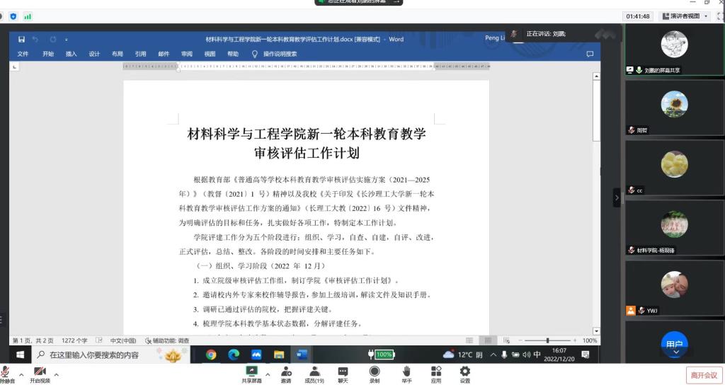 为迎接教育部新一轮本科教育教学审核评估,12月20日下午3:30,无机非金属材料工程系召开线上会议,就《437必赢会员中心新一轮本科教育教学审核评估工作方案》、《材料科学与工程学院新一轮本科教育教学审核评估工作计划》等相关文件开展学习研讨,会议由系主任刘鹏主持,全系教师线上参会。会上,刘鹏首先介绍了学校印发的审核评估工作方案。随后,刘鹏结合无机非金属系已经开展的工程教育认证工作,对审核评估中的指标体系进行了分项解读,并依次就学院自评结果进行了说明。