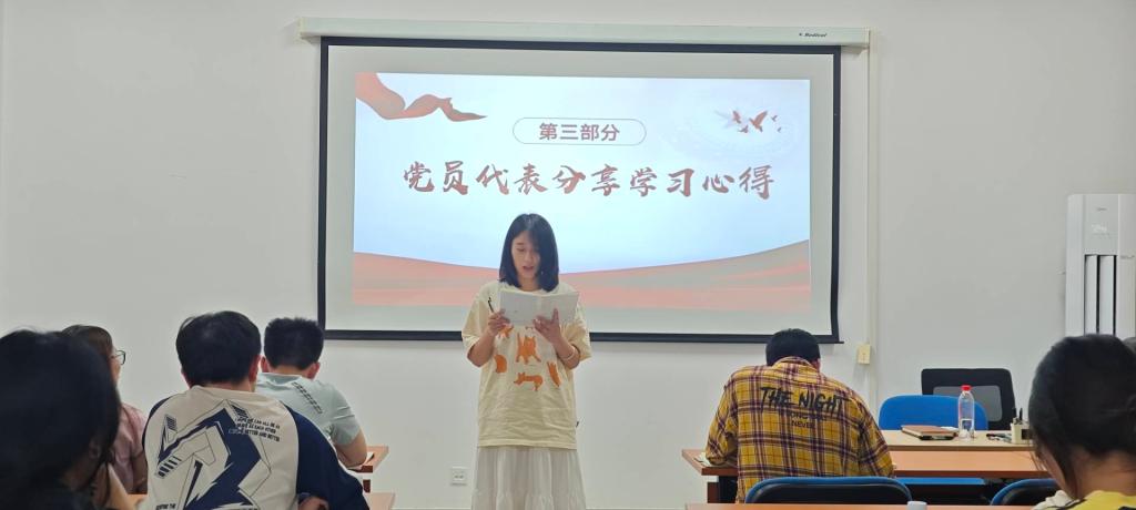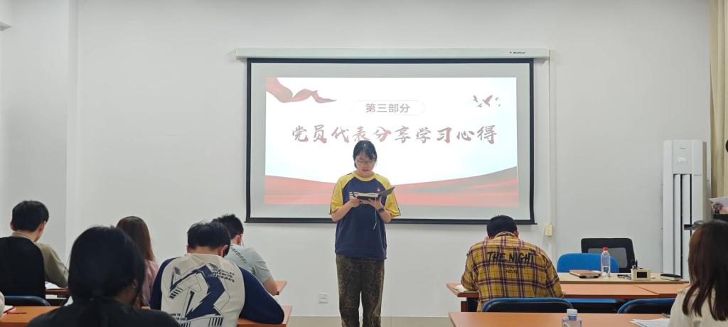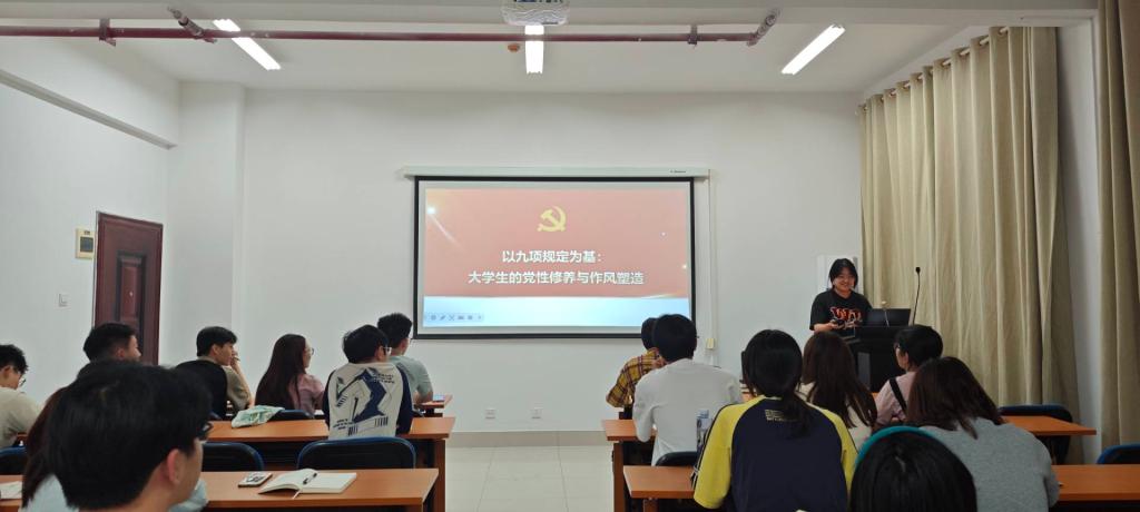 首先,党员代表梁静薇讲授微党课《以九项规定为基:大学生的党性修养与作风塑造》,她通过讲解九项规定详细内容,结合大学生实际生活,强调大学生党员如何践行九项规定。