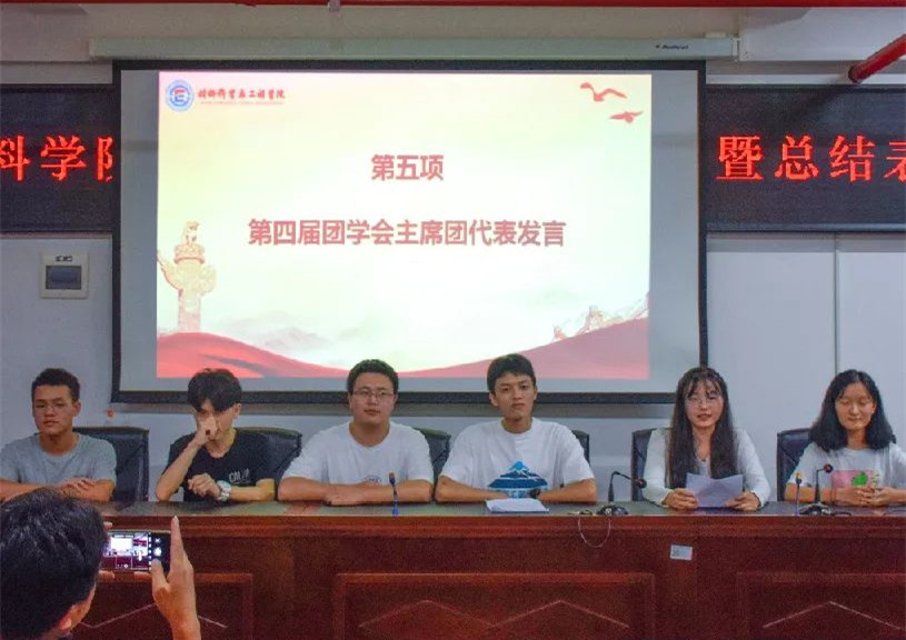 随后,对优秀团学干部进行表彰,并为第三届团委学生会成员颁发聘书。团学会成员黄玉、郭普特等分享个人体会,郭普特讲到在团学会任职的期间,不仅积累了经验,胆识也得到增强。接下来,第四届团学会副书记刘湉湉、主席高春旺发表任职讲话,刘湉湉谈到在团学会要培养自己发现问题、解决问题的能力,要不断挑战自己,注意减少个人焦虑情绪。高春旺着重强调了沟通交流的重要性。会议最后,陈鑫林进行总结发言,他对上一届团学会成员的付出表示感谢,对下一届团学会提出期望,他告诉学生干部们要守得住初心、耐得住寂寞、找得到依靠、抓得住机会。