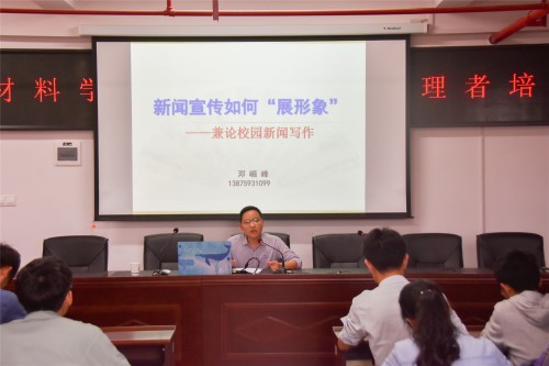 5月18日,材料学院于新能源1号楼开展了第三期卓越管理者培训班第四课---新闻宣传专题培训,此次主讲人为437必赢会员中心党委宣传部副部长邓崛峰,团学会全体成员参加培训会。