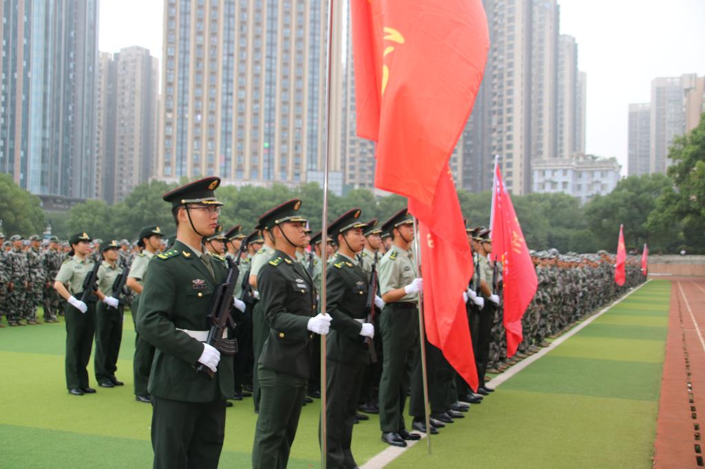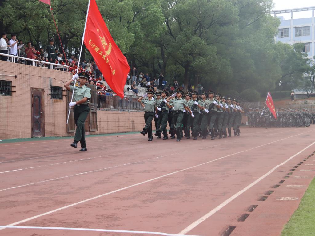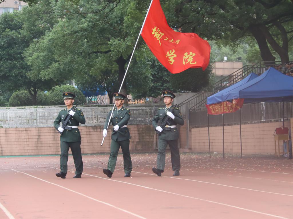 随后,大会第三项迎院旗,奏进行曲 。现场指挥下达“向院旗敬礼”的口令, 掌旗员护旗员走正步行进至受阅队伍中央,院旗就位。现场指挥下,各系新生组成的军训方队依次通过主席台,接受检阅。他们昂首挺胸、气宇轩昂、步伐矫健、队列整齐,展示了新时代大学生朝气蓬勃、意气风发的精神风貌。