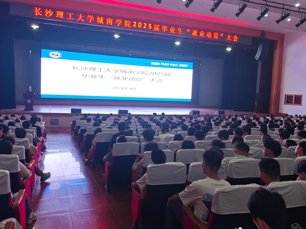 为全面推进学院2025届毕业生就业工作,引导毕业生树立正确的就业观念,提高就业积极性和主动性,9月3日,城南学院在五教大礼堂召开2025届毕业生就业动员大会。学院党委书记施一满、党委副书记陶双、副院长朱广峰、副院长贺晖、招就办主任廖瑞虎、各系党总支书记和就业专干出席会议,全体2025届毕业生参加会议。会议由陶双主持。