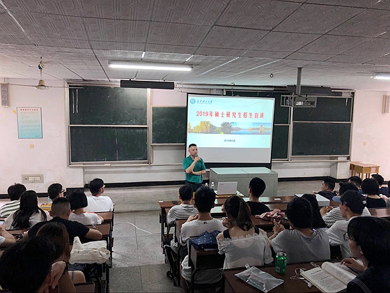 龚文斌以详实的数据资料对比了国内外研究生教育发展状况,从国家事业发展和时代进步对高层次人才需求的角度,指出了大学生考研深造的重要意义;他详细介绍了学校的研究生教育师资力量、学科优势和特色、科技创新平台、奖助学金政策、招生计划与政策等同学们热切关注的问题,鼓励优秀学子积极报考本校研究生;他希望有志青年学子能合理评估自身实力,明确努力方向,不畏严寒酷暑,以辛勤的付出来实现自己的考研梦想。