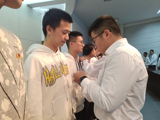 大会开始第一项,全体起立,奏唱团歌并宣誓,在宣誓过程中,大家声音洪亮且富有激情,表达了对共青团和党组织的热爱。紧接着由老师们为主席团成员和各部门干事佩戴团徽,并拍照留念,整个过程有条不紊,在欢声笑语的交谈中拉近了老师与学生的距离。大会第三项是各部门展示风采,各干部介绍本部门工作事项,让干事们能够对每个部门的工作职能有所了解。