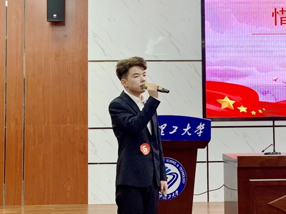 经济管理系三号选手昂首挺胸,自信地在台前讲述:回眸历史长河,要弘扬革命传统,担当起强国复兴的使命;要汲取历史教训,贡献出自己的一份力量。