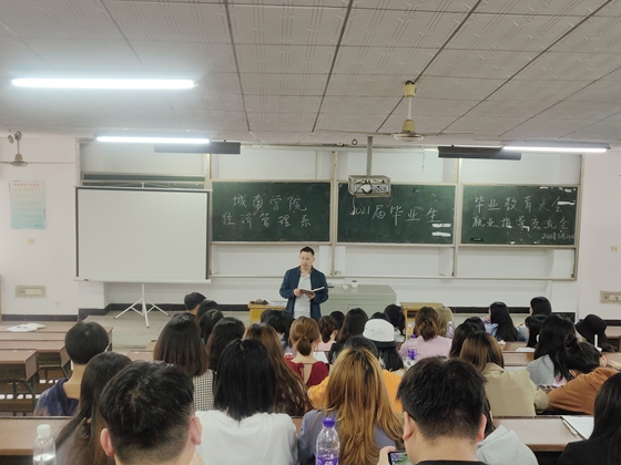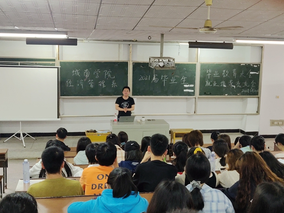 5月24日下午,经济管理系在12教100召开了2021届毕业生年级大会暨就业指导大会。学院副院长朱广峰、学院就业指导中心主任蔡湘粤、经济管理系主任周常国以及经管系全体2021届毕业生参加,年级辅导员田帅主持。
