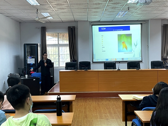 最后,刘更祥对本次讲座进行了总结。他指出,文学研究要有家国情怀,外国文学研究要关注中国对世界的认识和外国对中国的认识,文学研究也要关注社会问题的解决。本次讲座体现了外国语学院倡导的思政工作贯穿教学全过程,从专业角度、学术视角加强爱国主义教育,同时也丰富了同学们的精神文化生活,激发了学生鉴赏诗歌,创作诗歌的热情,引导学生学会欣赏生活中的美。对学院良好的学习氛围的形成具有积极推动作用。