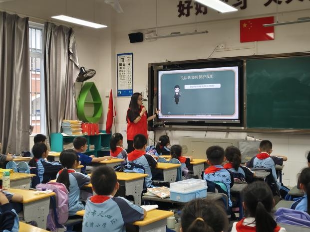 本次法治教育课通过引入《民法典》,用通俗易懂的语言,形象生动的案例,深入浅出地向同学们介绍了什么是《民法典》以及讲解了《民法典》中正当防卫、自甘冒险、见义勇为等内容概念,教导小朋友们运用法律知识武装自己,维护自己的合法权益。课堂上小朋友们纷纷化身小法官,在讲解人的带领下一起分析相关小案例,大家热情洋溢,纷纷举手互动,表达自己的想法和见解。
