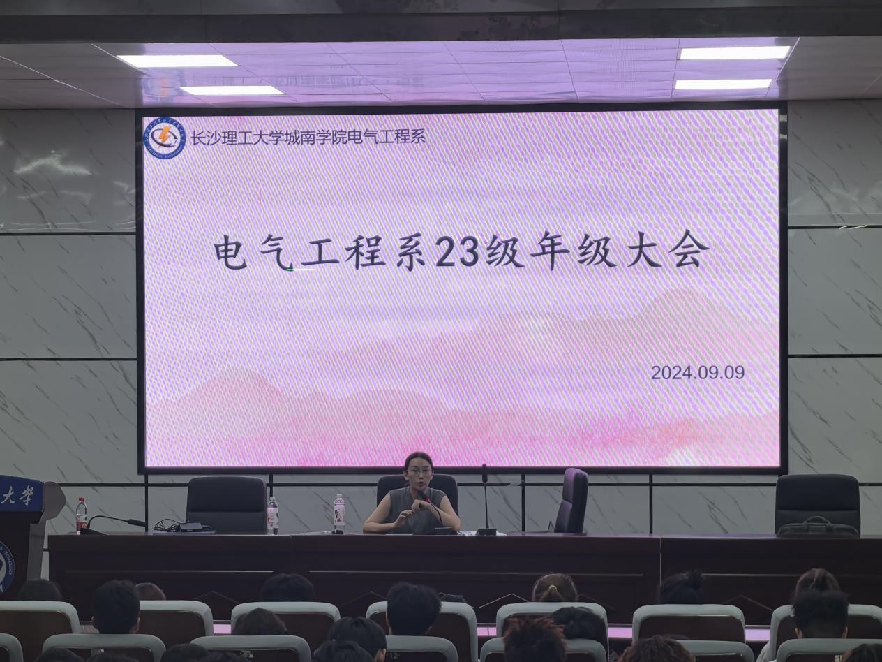 9月9日晚19:00,437必赢会员中心城南学院电气工程系于在四教报告厅召开了23届学生年级大会。本次会议由辅导员向陈老师主持,23级全体同学参会。