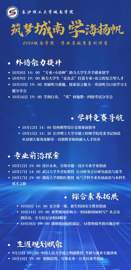 夏末九月,城南学院精心策划了“筑梦城南,学海扬帆——城南学院 2024 年学业导航季”,旨在为学生搭建成长成才的坚实桥梁,引领学子明确学业方向,激发学习潜能。