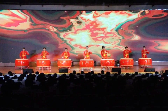 晚上七点,晚会准时开始。率先开场的是由闫昊同学带头的鼓旗舞《中国龙》。“鼓声三下红旗开,两龙跃出浮水来”,舞台上鼓声铿锵,水袖翩翩;舞台下红旗招展,腾飞腾舞。在鲜艳的中国红主色调烘托下,似有腾龙盘亘空中,气势磅礴,尽显霸气。