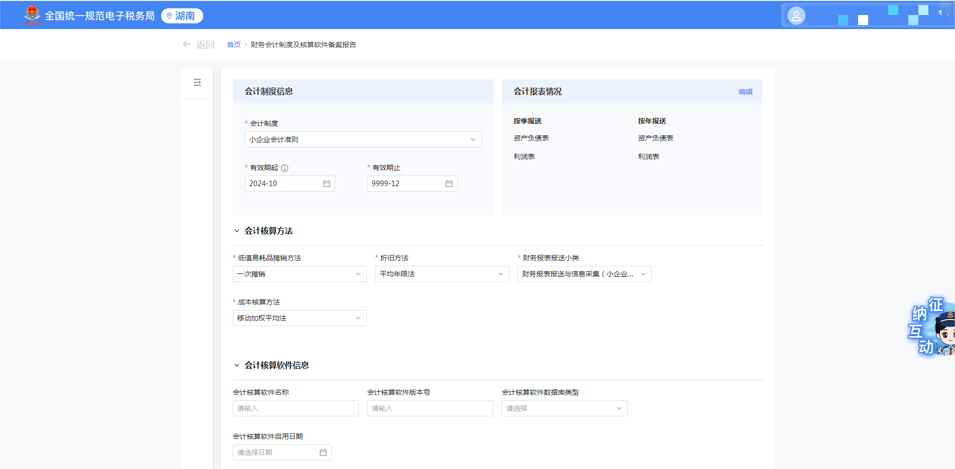 操作指引:依次点击【我要办税】-【综合信息报告】-【财务会计制度及核算软件备案报告】进入功能页面,或搜索“财务会计制度及核算软件备案报告”,进入备案页面,根据纳税人实际会计核算情况进行选择。
