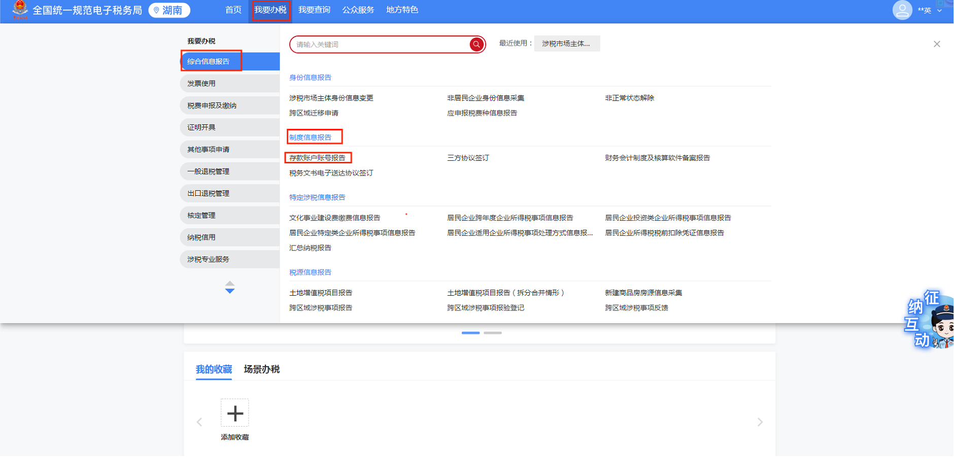 操作指引:电子税务局首页点击【我要办税】—【综合信息报告】—【制度信息报告】-【存款账户账号报告】,也可在右上角搜索框直接搜索关键词进入办理页面。