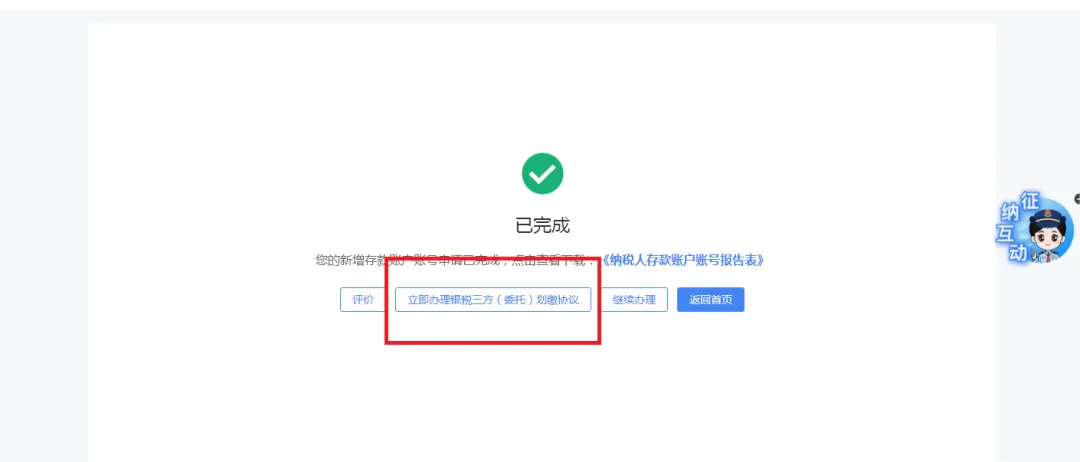 操作指引:存款账户账号报告完成后,点击【立即办理银税三方(委托)划缴协议】,直接跳转至三方协议签订页面,也可在右上角搜索框直接搜索关键词进入办理页面。