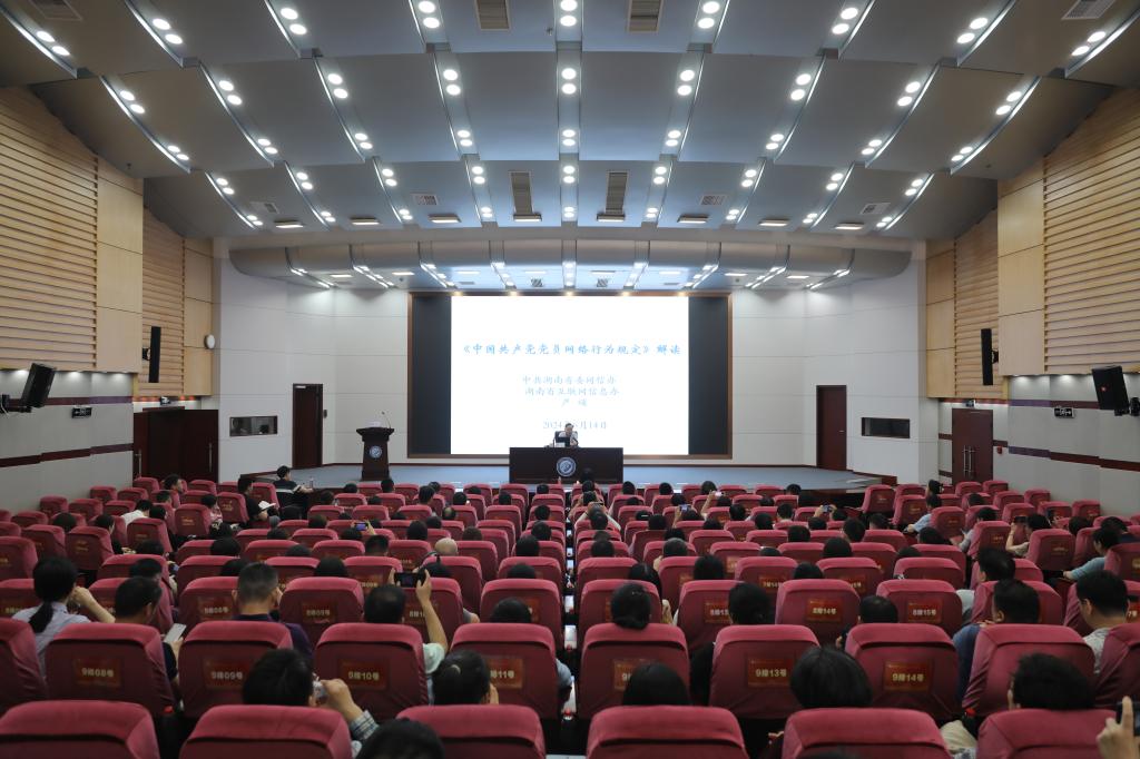 6月14日,必赢官网在云塘校区图书馆报告厅组织新任职处级干部任职能力提升专题培训班、机关科级干部培训班第场培训。中共湖南省委网信办网络执法与监督处处长严颂应邀作专题讲座。全体新任职处级干部和机关科级干部参加培训。培训由校党委委员、宣传部部长方琼主持。