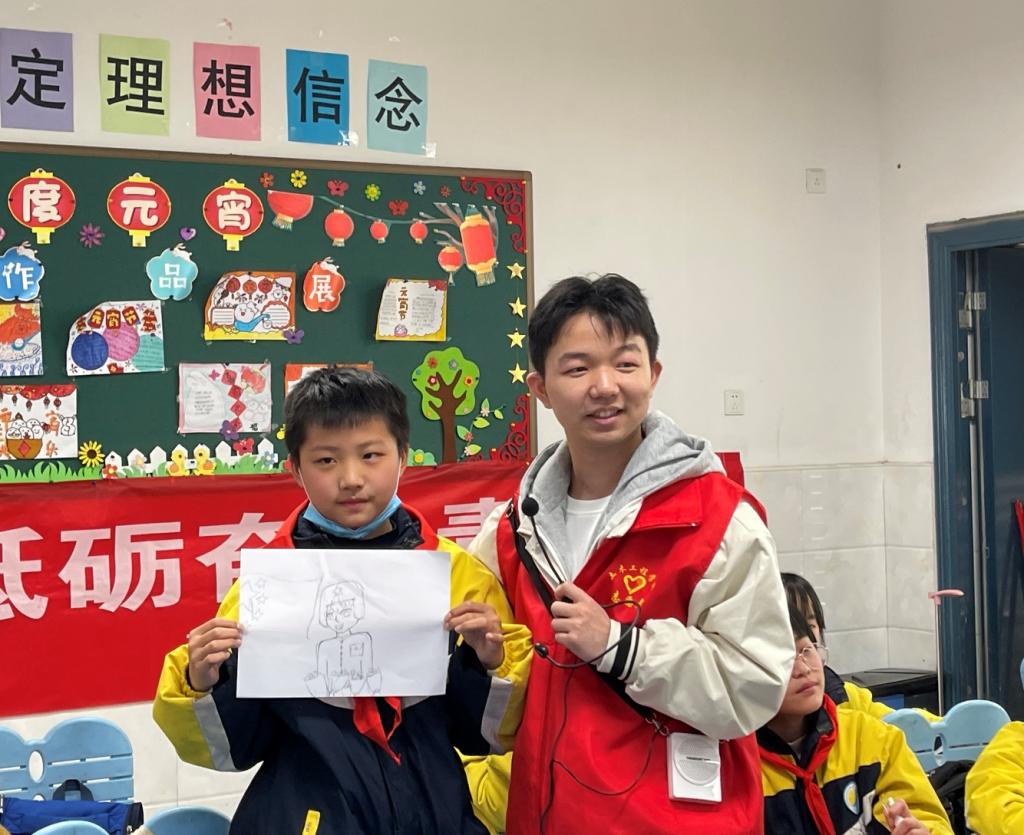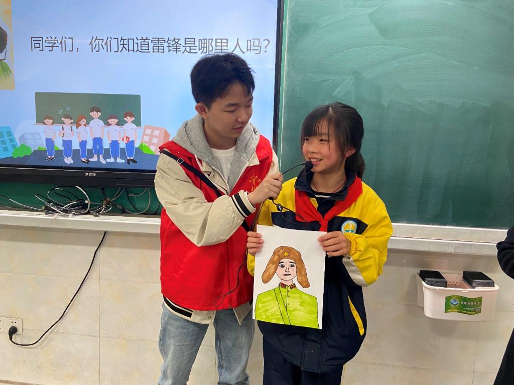 在互动环节,小学生们或分享身边的雷锋事迹或对根据自己的理解对雷锋同志进行人物画像。1班学生梁梦琪表示:“身边的雷锋事迹有很多,班级同学小李每天帮助因手受伤打石膏行动不便的小张同学打饭、提书包等就是在实践雷锋精神。”小学生李依彤画的是雷锋背着一个人在走路的场景,“我的画是想表达雷锋出差一千里,好事做了一火车。因为雷锋经常出去做报告,他走到哪里就把好事做到哪里。他看到列车员忙不过来,就主动帮忙扫地、擦玻璃、倒开水等,忙个不停。看到有背着小孩的妈妈不小心把车票弄丢了,也会主动伸出援手为她再买一张车票,并且实实在在做到了做好事不留名。”李依彤这样分享到。
