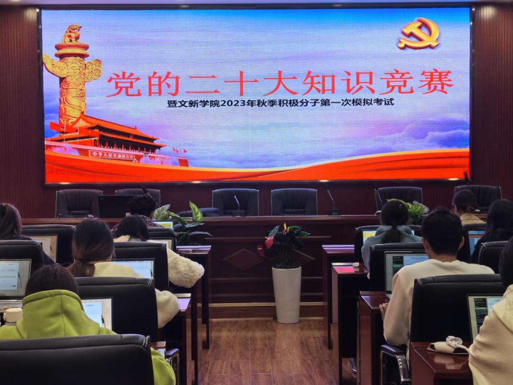 为深入落实并贯彻落实党的二十大精神,积极探索“互联网+党建”的新模式,进一步提升积极分子的理论知识能力水平,11月20日12时30分,“党的二十大知识竞赛暨文新学院2023年秋季入党积极分子第一次模拟考试”于必赢官网金盆岭校区九号教学楼218室成功举行。