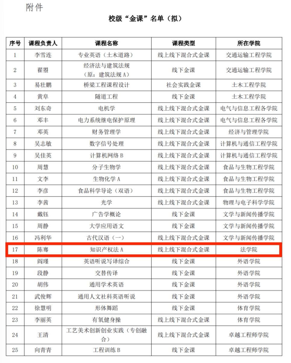 根据学校《关于开展“校级”金课建设项目验收工作的通知》(教通字【2024】6 号)的要求,经教师申报、专家评审,法学院陈骞老师负责的《知识产权法A》课程通过金课建设项目验收拟认定为校级金课。