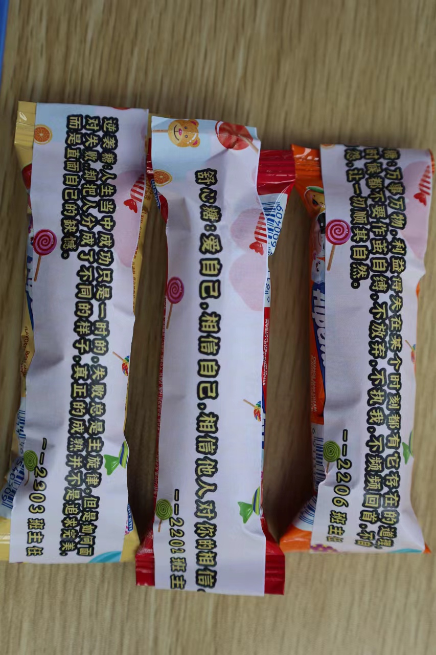 分别是解压糖、舒心糖、融洽糖、逆袭糖、理想糖和哲理糖,寓意给生活一颗糖,缓解压力、舒畅心灵、融洽关系、逆境突袭、树立理想和明哲辨理。有的同学还录制视频