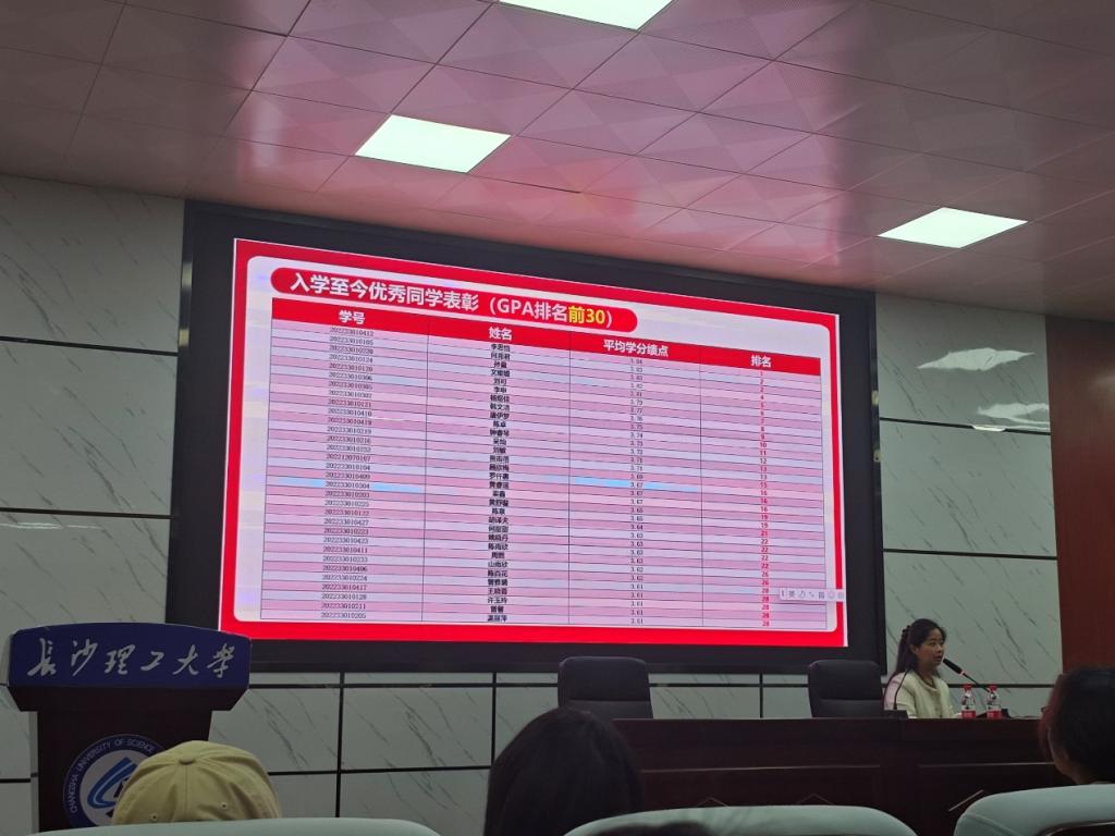 随后,孙佳乐就学风建设、学情分析、心态调整和日常管理进行了讲解。她提醒同学们规律作息、加强运动、注重身心健康,并对成绩进步显著的李金皓、王佳怡等一部分同学,以及入学以来绩点排名前30名的李思怡、何湘君等同学予以表扬。此外,孙佳乐公布了各班校外导师的分配情况,建议同学们积极向导师请教考研、就业困惑。她还向同学们说明了开学以来学院为大家做的工作:优化教学楼环境,清扫整理自习室、增设资料储物柜、配置恒温饮水机等。