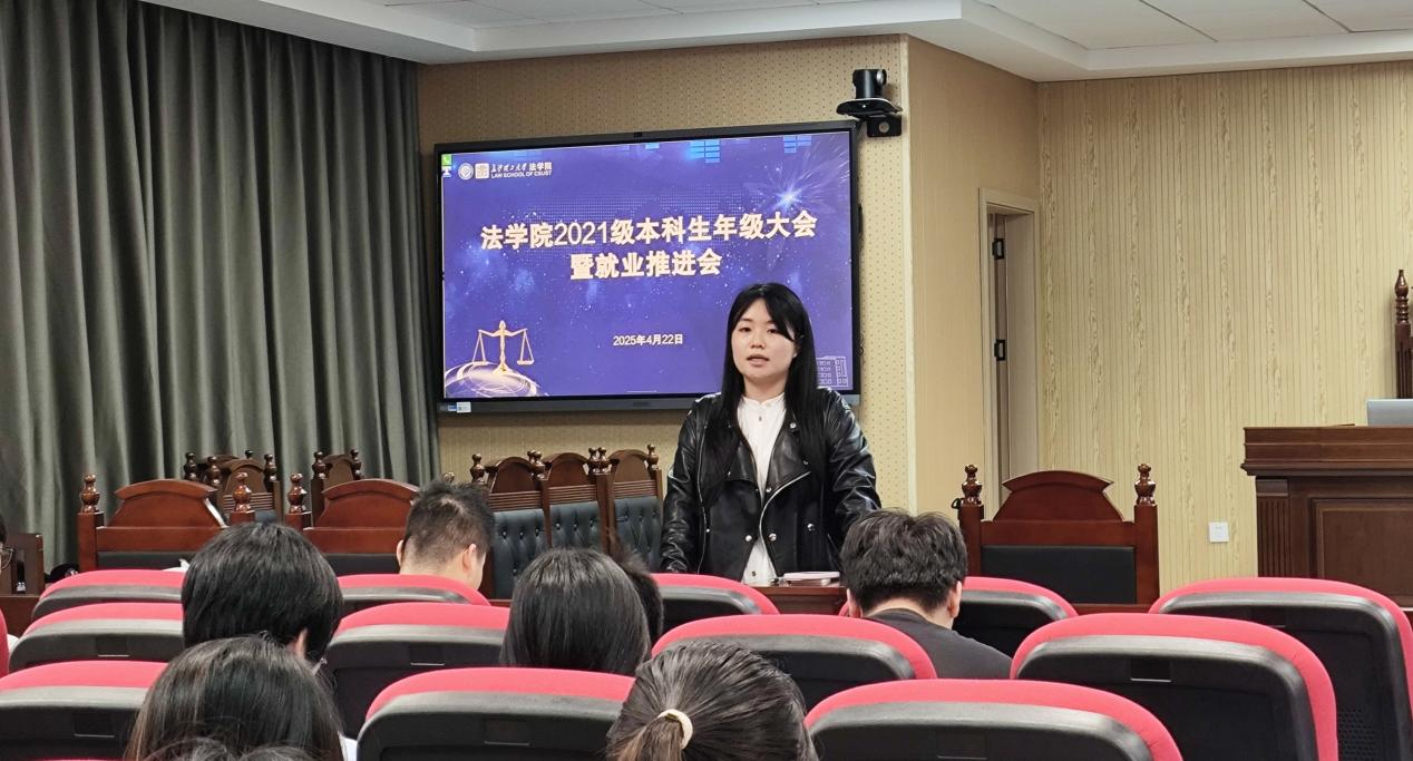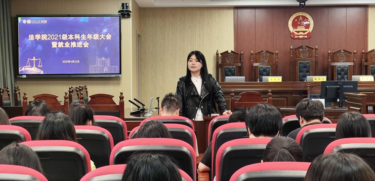 4月22日下午16:30,法学院在四教模拟法庭召开2021级本科生年级大会暨就业推进会。辅导员曾宇欣及全体2021级本科生参加会议。会议聚焦毕业关键环节和就业推进工作。
