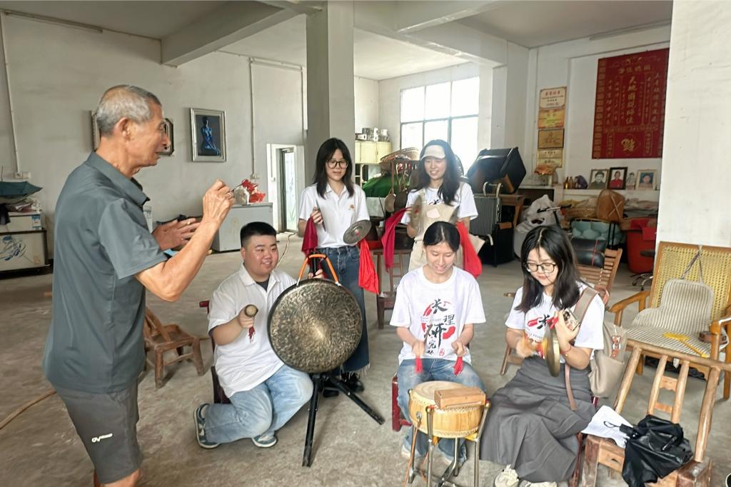 桑植花灯省级非遗传承人满元恒和市级非遗传承人李晓香,随后也来此与实践团成员会面。满老虽已年逾古稀,但谈起花灯传承,眼中依然闪烁着炽热的光芒,他深情讲述了自己因热爱而坚守传承花灯70年的传奇经历。满老的搭档李晓香老师也分享了自己在花灯传承中的动人故事。那些风雨兼程的岁月里,他们两个凭借着对花灯艺术的执着,克服了重重困难,让桑植花灯在岁月的长河中熠熠生辉。随后,满老和李晓香老师一起加入了彭辉峪的演出,在唢呐、围鼓、头钹的交响中,实践团成员感知了一场精彩纷呈的视听盛宴。