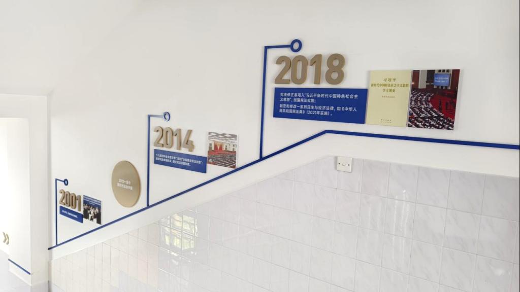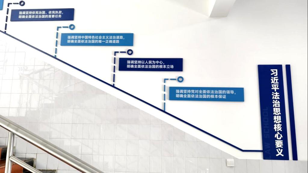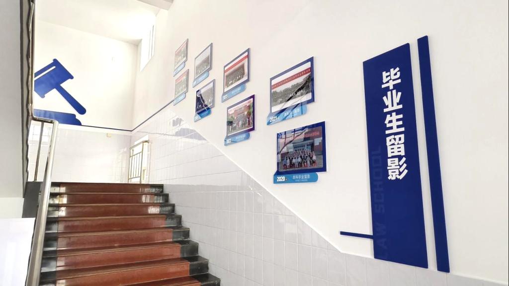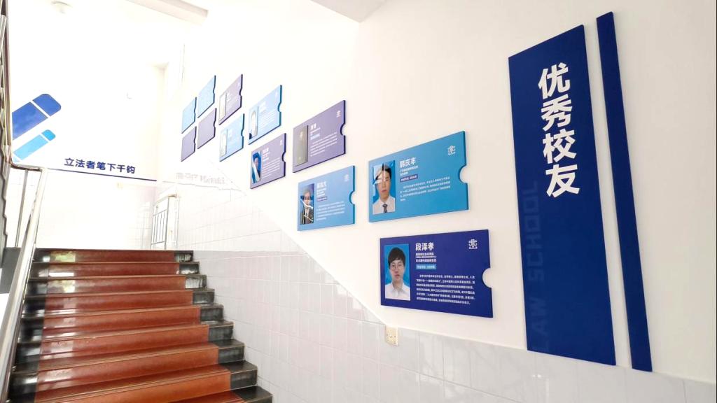 沿左侧扶梯拾级而上,法治思想指引板块紧扣新时代法治国家建设需求,系统阐释“党的领导、人民当家作主、依法治国”的内在统一,为师生提供坚实的理论坐标与行动指南。与之相邻的校友风采墙,则通过一张张照片与一行行文字,定格青春记忆,讲述校友在立法、司法、学术、公益等各领域的法治故事,彰显“今日我以学院为荣,明日学院以我为傲”的传承。