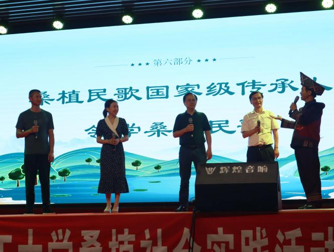为了吸引广大群众前来观看,老师们还前往当地艺术团邀请桑植民歌国家级传承人尚生武老师。演出现场,座无虚席,当地百姓自发前往。当地艺术家们的《花灯喜赞二十大》《桑植是个好地方》等节目与同学们的反拐普法剧、禁赌宣传剧以及《仰望星空》《如愿》《有我》等合唱相得益彰,四个实践调研组的汇报也穿插其中,现场气氛十分活跃。在全场大合唱《灯火里的中国》中,汇报演出结束。