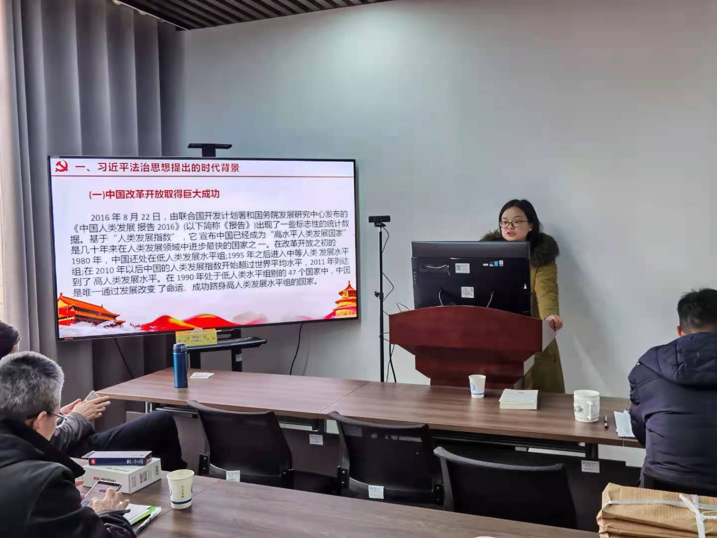 陈杨在题为《学习习近平法治思想》的专题党课中,首先从时代背景来分析我党所面临的形势,着重梳理了习近平法治思想形成的历史脉络,阐述了习近平法治思想的核心要义。2020年11月中央全面依法治国工作会议将习近平法治思想明确作为全面依法治国的指导思想。习近平法治思想的提出是顺应实现中华民族伟大复兴时代要求应运而生的重大理论创新成果,是马克思主义法治理论中国化的最新成果,是习近平新时代中国特色社会主义思想的重要组成部分,是全面依法治国的根本遵循和行动指南。只有全面依法治国才能有效保障国家治理体系的系统性、规范性、协调性,才能最大限度凝聚社会共识。