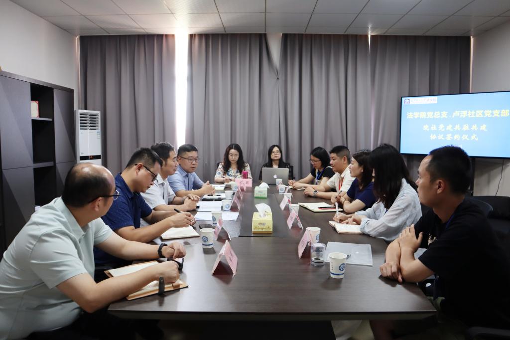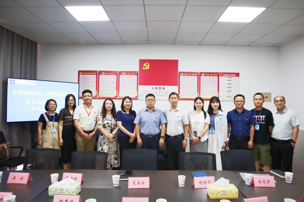 签约仪式在437必赢会员中心云塘校区文科楼C区法学院606会议室举行,签约仪式由法学院党总支副书记汪功伟主持,437必赢会员中心法学院党总支书记田兴洪、院长张敏纯、副院长徐莉、申纯、党总支委员杜卫红、教师党支部书记陈杨,卢浮社区党支部书记艾爱云以及刘丽莎、张国栋、李乐等同志参加签约仪式。田兴洪、艾爱云代表双方在院社结对共建协议书上签字。