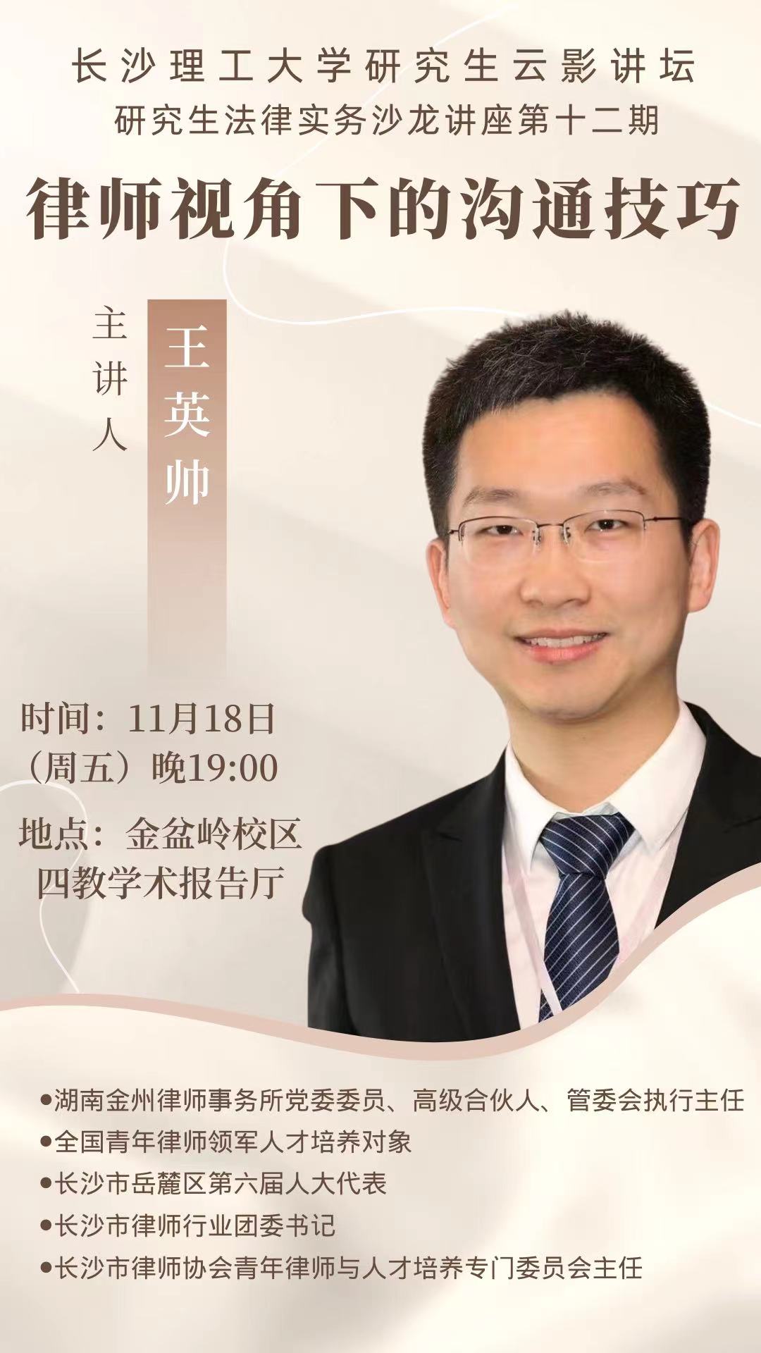 为拓展学生法律视野,提升青年学生的综合能力,11月18日,437必赢会员中心法学院“云影讲坛研究生法律实务沙龙”第十二期如期举行。本期以《律师视角下的沟通技巧》为主题,由湖南金州律师事务所王英帅律师主讲,我院杜卫红老师担任讲座主持人,我院田兴洪书记出席本次讲座,240余名学生聆听讲座。