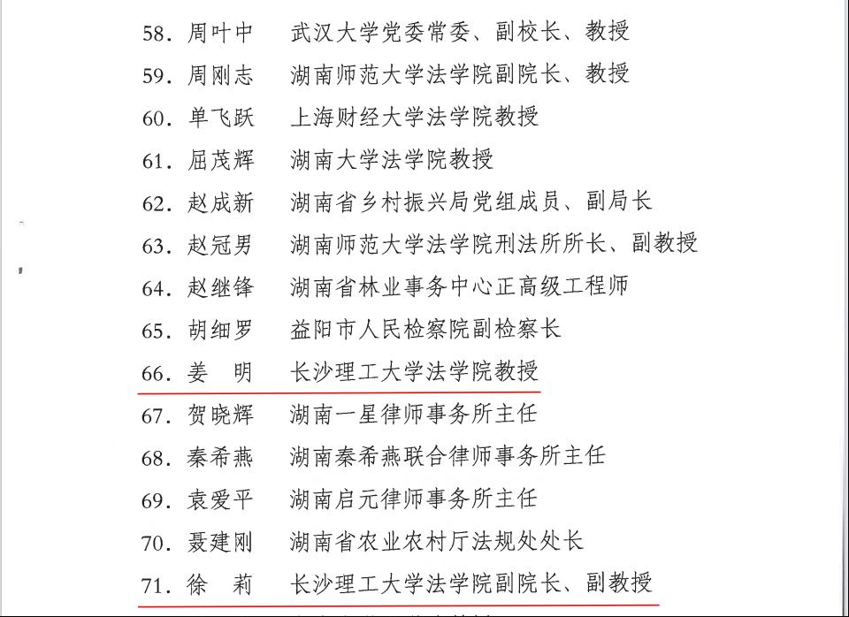近日,省司法厅开展了湖南省政府立法专家选聘工作,我院院长张敏纯教授、姜明教授、副院长徐莉副教授三位老师受聘。