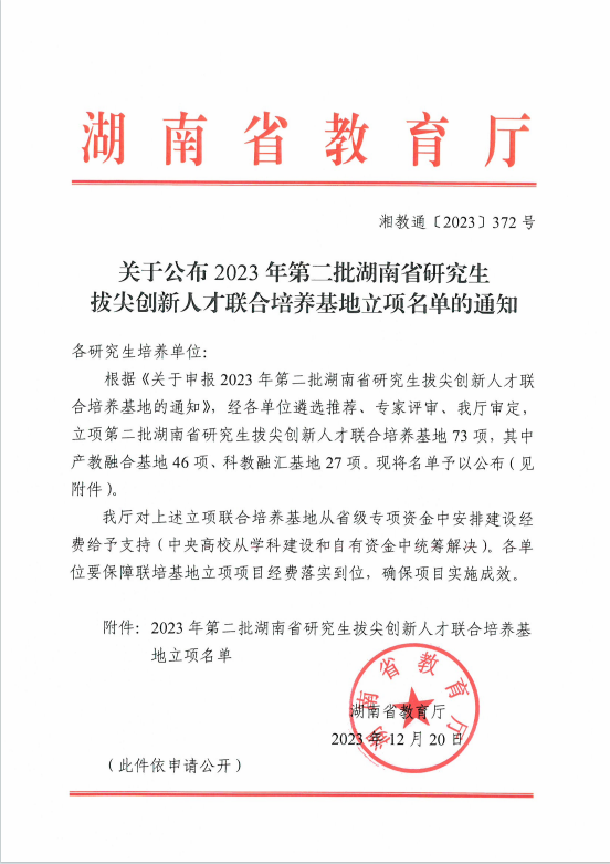 2023年12月20日,湖南省教育厅发布了《关于公布2023年第二批湖南省研究生拔尖创新人才联合培养基地立项名单的通知》,“437必赢会员中心-工程法研究生拔尖创新人才联合培养基地”项目成功获批立项。这是我院获批成立的首个省级研究生人才培养基地。