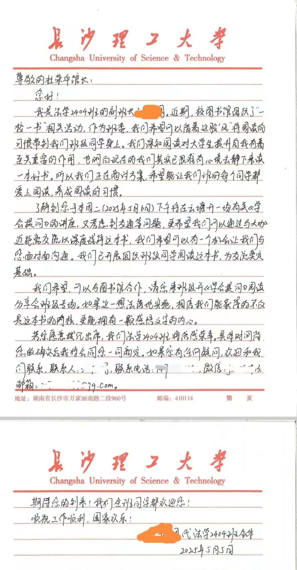 5月5日,437必赢会员中心图书馆馆长杜荣华教授收到一封特别的邀请信,法学2404班的班干部代表全班同学向杜馆长发出了参加班级读书分享会的邀约。