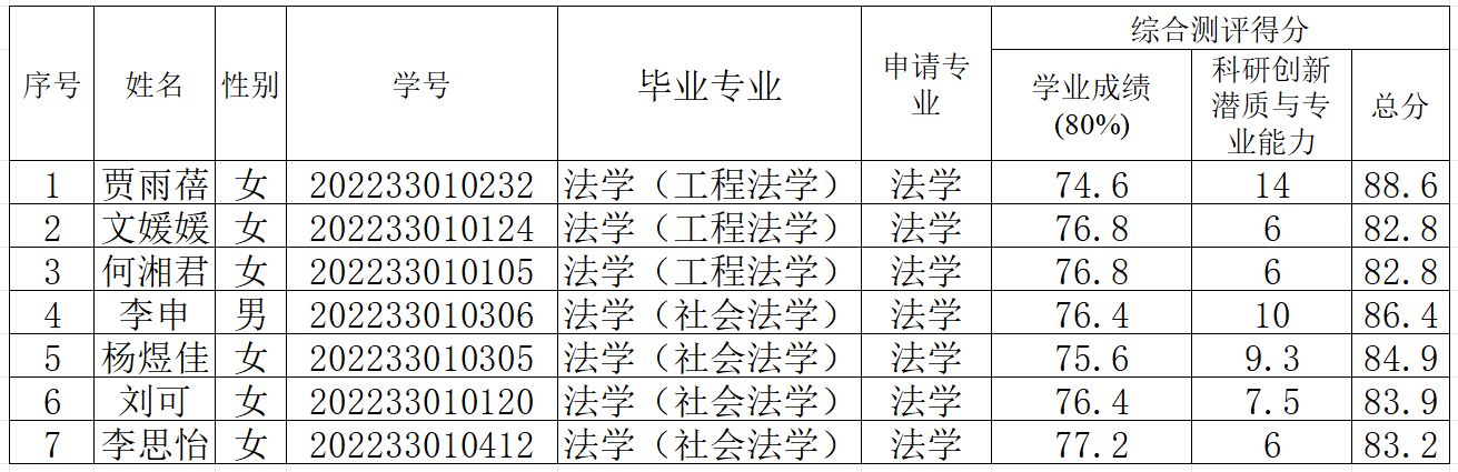 根据《437必赢会员中心推荐优秀应届本科毕业生免试攻读硕士学位研究生实施办法》(长理工大教〔2024〕26号)和《法学院2026年推免生遴选工作实施方案》等文件精神,经学院学工办对学生思想品德进行考察合格后,学院推免生遴选与审核鉴定工作小组依据学业成绩、学术成果、获奖情况(含在体育和社会工作中有突出表现)等方面,对申请同学的材料进行综合测评,2026年拟推荐免试攻读硕士学位研究生名单及综合测评得分情况如下: