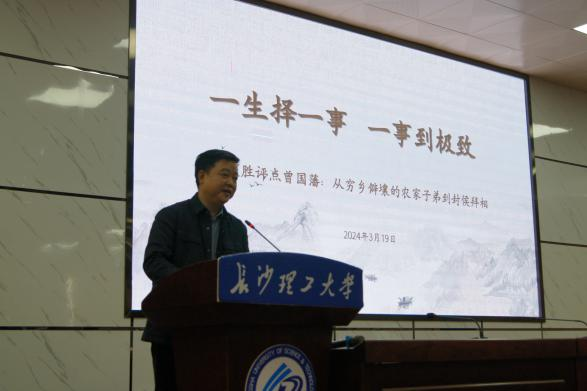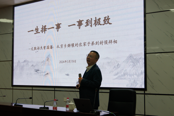 “在追求卓越的路上,如何做到一生择一事,一事到极致?”3月19日下午15点,我院诚挚邀请到湖南师范大学客座教授、创源普惠金信科技有限公司董事长,湖南创源软件有限公司董事长,湘水读书会会长李文胜在金盆岭校区四教学术报告厅举办了主题为“一生择一事,一事到极致”的职业与人生大讲堂。李文胜教授用一场生动的讲座深入解析了曾国藩的人生哲学,为同学们给出了这个问题的答案。法学院党委书记龚文斌、全体辅导员和200余名学生参加此次讲座,法学院党委副书记、副院长汪伦担任讲座主持人。