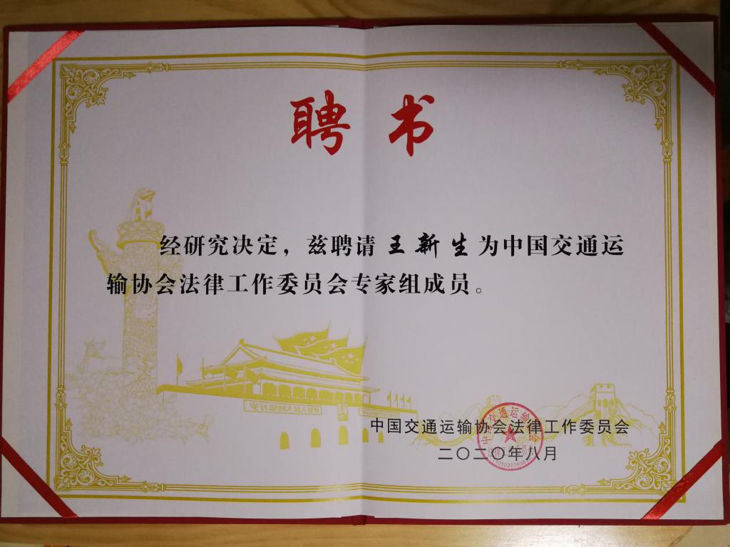 王新生教授受聘为中国交通运输协会法律工作委员会专家组成员
