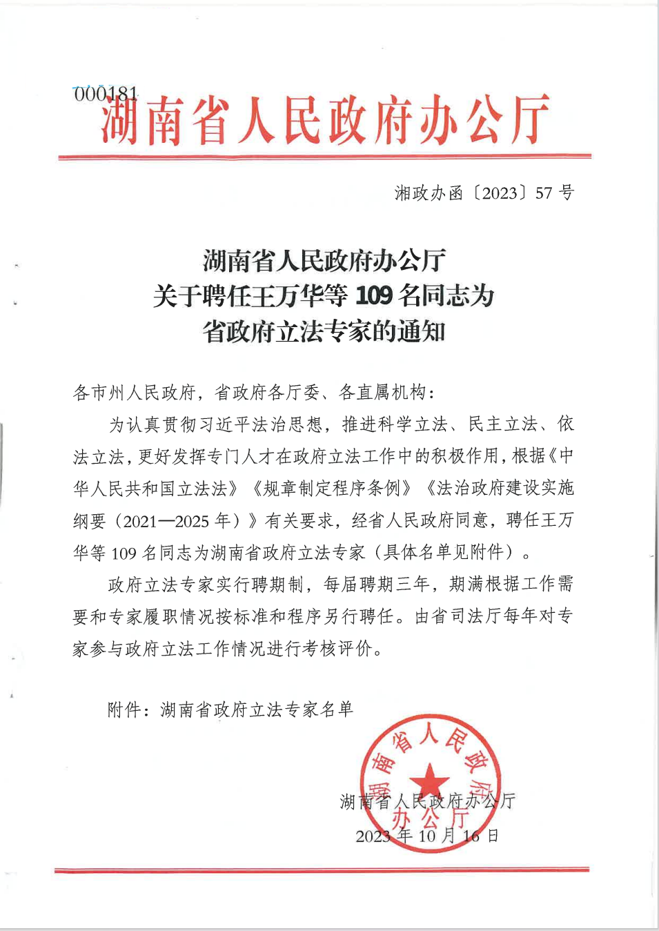 近日,省司法厅开展了湖南省政府立法专家选聘工作,我院院长张敏纯教授、姜明教授、副院长徐莉副教授三位老师受聘。