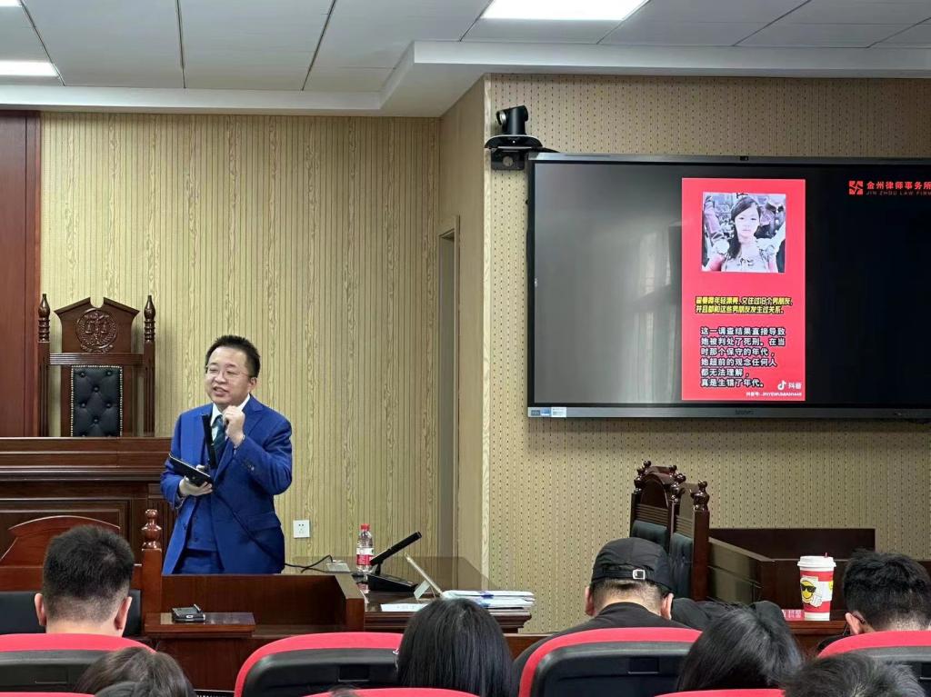 2023年3月6日,湖南金州律师事务所董事、高级合伙人甘元春律师受437必赢会员中心法学院邀请,以一名刑辩律师的执业经历,给法学院20级的同学们上了一堂形象而又生动的模拟法庭课。