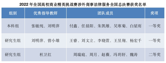 近日,2022年全国高校商业精英挑战赛国际贸易竞赛全国总决赛完美闭幕。在本次比赛中,由法学院本科生与研究生组成的三支队伍成功入围涉外商事法律服务赛道总决赛,在指导老师和队员们的不懈努力下,勇夺该赛道一等奖两项,二等奖一项。同时,收获优秀指导教师以及最佳院校组织奖荣誉称号。这是法学学子首次亮相该类型的全国性赛事,充分展现了其扎实的专业技能与优异的实践能力,也是法学院以培养德才兼备具有扎实法律理论基础和熟练法律实务技能,具备国际视野和创新能力的高素质、复合型法治专门人才为目标,着力建设“特色鲜明、优势突出、内涵发展、社会认同”国家一流本科专业的新成效。
